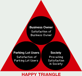 Having this motto in mind, we have been focusing our business in the realm of parking, a part of the urban infrastructure. Our effort is on its way. We have been transforming the parking lot business, its perceptions and the market for the greatest happiness with the maximized profit. Since the establishment our company, we have put our effort in parking lot business evolution and in finding the structure to make everyone happy. Backed by the "Happy Triangle" concept, our efforts culminated into our methods, which are generating quite an extraordinary business momentum. |