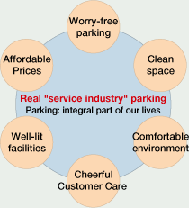 Transforming what "parking lot business has been" to the "future of parking business" Our venture is to dramatically transform the business structure of parking and the perception of its businesses. First, we are-evaluating parking business as to what a bona fide "service industry" player should be. Our relentless effort for parking business evolution continues. |